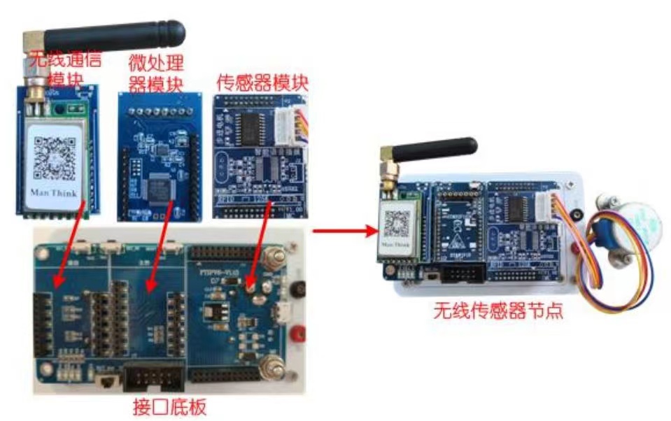無(wú)線傳感器節(jié)點(diǎn)采用模塊化設(shè)計(jì),主要由接口底板、無(wú)線通信模塊、微處理器模塊、及傳感器調(diào)理板組成,通過(guò)插針對(duì)應(yīng)連接而成,支持自由組合。Cortex-M3核的微處理器模塊自帶 OLED 屏顯示網(wǎng)絡(luò)信息、組網(wǎng)狀態(tài)、以及傳感器采樣數(shù)值。如圖所示,展示節(jié)點(diǎn)各模塊的連接方式。