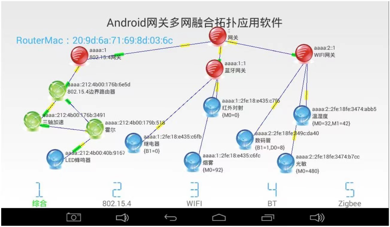 能夠?qū)⑺{(lán)牙、WiFi、IEEE802.15.4 無(wú)線網(wǎng)絡(luò)經(jīng)IPV6 協(xié)議融合在一個(gè)拓?fù)鋱D中,Zigbee 節(jié)點(diǎn)經(jīng)ZStack 協(xié)議展示在拓?fù)鋱D中;在界面上顯示藍(lán)牙、WiFi、RPL802.15.4、ZigBee 等節(jié)點(diǎn)的傳感器數(shù)據(jù)或執(zhí)行器狀態(tài);網(wǎng)關(guān)界面可顯示傳感器采集的數(shù)據(jù)、執(zhí)行器的狀態(tài),顯示藍(lán)牙、WiFi、IEEE802.15.4 傳感器節(jié)點(diǎn)的 IPv6 地址,顯示ZigBee 傳感器節(jié)點(diǎn)組網(wǎng)短地址,能夠隨意拖動(dòng)傳感器,而不改變網(wǎng)絡(luò)的拓?fù)浣Y(jié)構(gòu);點(diǎn)擊網(wǎng)關(guān)上傳感器節(jié)點(diǎn)圖標(biāo),可進(jìn)入二級(jí)界面查看傳感器的實(shí)時(shí)曲線走勢(shì),或手動(dòng)控制執(zhí)行器的開(kāi)關(guān)。 |
