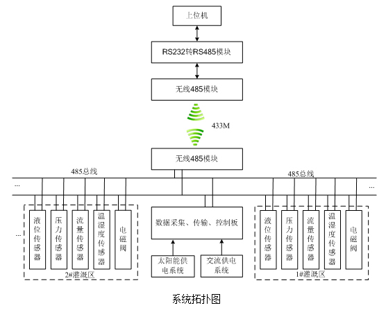 系統(tǒng)主要由各種工業(yè)傳感器、工業(yè)控制設(shè)備、數(shù)據(jù)采集系統(tǒng)、太陽能供電系統(tǒng)、無線485模塊、上位機(jī)等組成。其構(gòu)成拓?fù)淙鐖D所示。