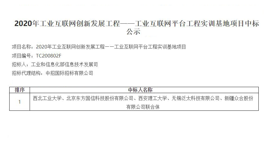 西工大、東方國信、西理工、無錫泛太、眾合聯(lián)合體在激烈競爭中不負眾望,中標工信部2020工業(yè)互聯(lián)網全國招標項目?,F公示期已結束,感謝各位朋友支持,這是無錫泛太繼2019后再次中標,泛太團隊還在為下一個目標而奮斗中。