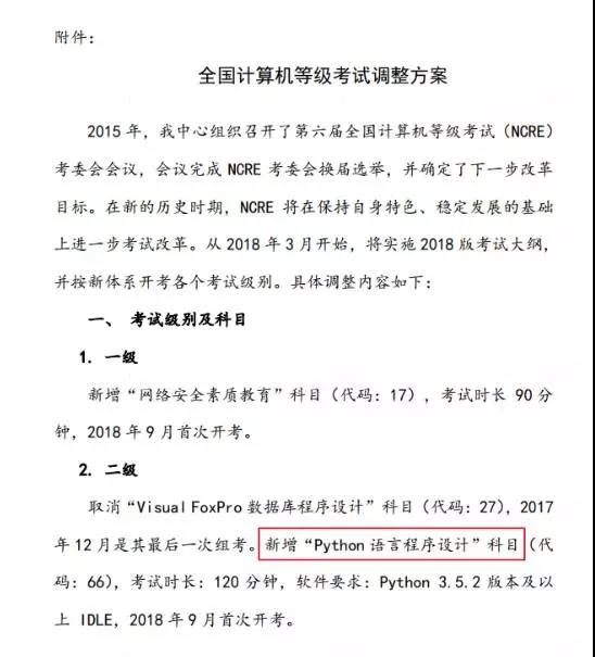 教育部考試中心于 2017 年 10 月 11 日發(fā)布了“關(guān)于全國計算機(jī)等級(NCRE)體系調(diào)整”的通知,決定自 2018 年 3 月起,在計算機(jī)二級考試加入了“Python 語言程序設(shè)計”科目。