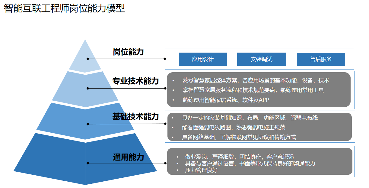 智能家居工程師分為三個(gè)級(jí)別,分別是智能家居服務(wù)工程師(初級(jí))、智能家居應(yīng)用設(shè)計(jì)工程師(中級(jí))、智能家居硬件開發(fā)工程師(高級(jí))。各個(gè)級(jí)別的崗位定義,是根據(jù)現(xiàn)場(chǎng)工作場(chǎng)景中典型工作任務(wù)的難易度來確定的。