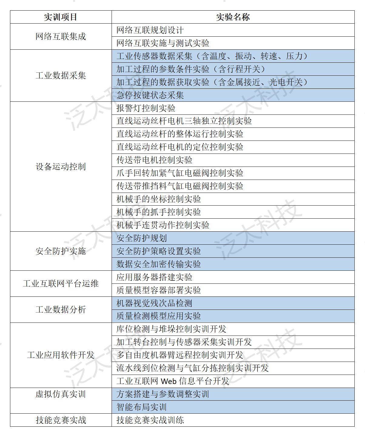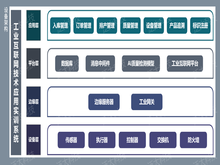 該設備以離散行業(yè)全流程產(chǎn)線為背景,具有完整的工業(yè)互聯(lián)網(wǎng)網(wǎng)絡、平臺、安全、標識體系架構(gòu),可以支撐工業(yè)互聯(lián)網(wǎng)專業(yè)數(shù)據(jù)采集、網(wǎng)絡互聯(lián)、安全防護、邊緣計算、平臺運維、數(shù)據(jù)分析、標識解析、工業(yè)APP等項目實訓,還可以開展智能制造專業(yè)電氣控制及運動控制,人工智能專業(yè)機器視覺及質(zhì)量模型分析等課程實訓,滿足學生全流程參與互動、多維度融合應用的需求。