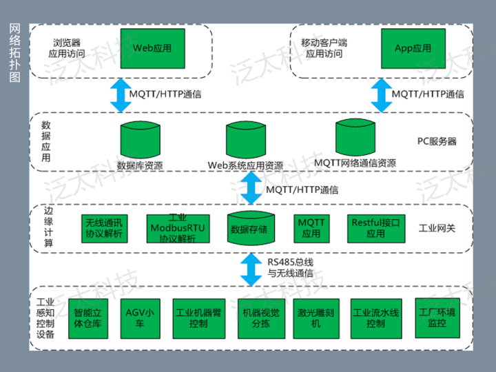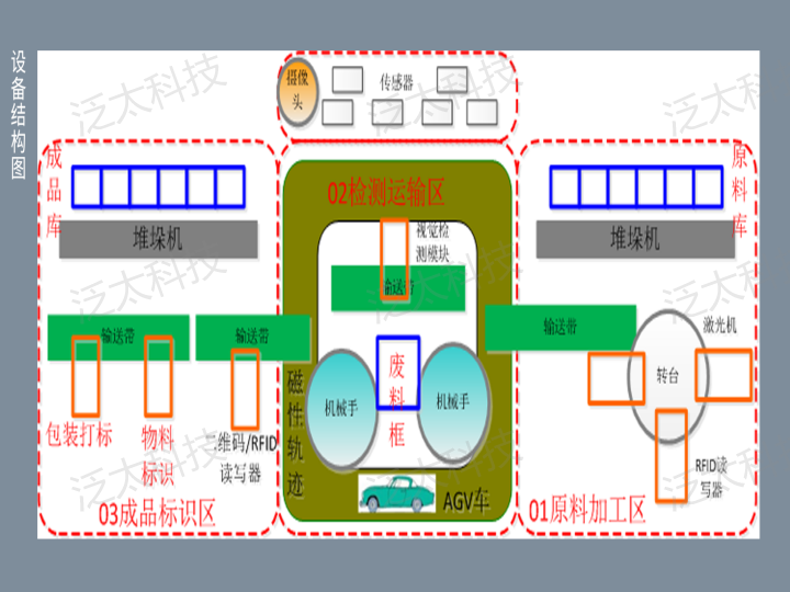 系統(tǒng)涵蓋立體倉庫堆垛機、加工轉(zhuǎn)臺、激光雕刻機、多自由度機器臂、AGV小車、機器視覺檢測裝置、流水線傳輸設(shè)備、RFID讀卡器、打碼裝置以及各種狀態(tài)監(jiān)測傳感器,通過PLC電氣控制、嵌入式應(yīng)用、AI機器視覺、工業(yè)現(xiàn)場總線和自組網(wǎng)通信等技術(shù),達到工業(yè)設(shè)備運動控制、運行狀態(tài)監(jiān)測,實現(xiàn)出庫、上料、寫碼、雕刻、傳輸、檢測、運輸、打碼、讀碼、包裝、入庫等完整的工藝流程;通過智能網(wǎng)關(guān)和工業(yè)互聯(lián)網(wǎng)平臺,實現(xiàn)設(shè)備接入、數(shù)據(jù)采集、數(shù)據(jù)上云、產(chǎn)線管理、工件質(zhì)量分析、以及可視化應(yīng)用。