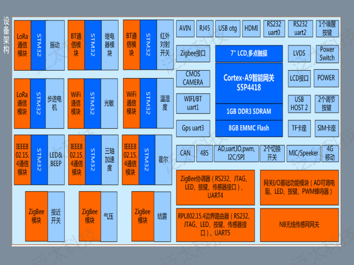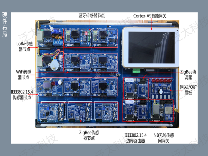 SeaIOT-B-WSN-2A型無線傳感網(wǎng)全功能實驗箱是SeaIOT-B-WSN-02型的升級版,集成Bluetooth、WiFi、IEEE802.15.4、ZigBee等短距離無線通信技術(shù),將6LowPAN(IPv6)互聯(lián)網(wǎng)協(xié)議應(yīng)用到短距離無線通信網(wǎng)絡(luò)中,與ZigBee使用的ZStack協(xié)議棧并存,支持雙協(xié)議棧;集成LoRa、NB-IoT等長距離無線通信技術(shù),自定義傳感網(wǎng)協(xié)議,CoAP應(yīng)用協(xié)議,實現(xiàn)主從機組網(wǎng)應(yīng)用,平臺接入應(yīng)用。采用三星Cortex-A9 S5P4418四核處理器作為智能網(wǎng)關(guān),支持6LowPAN、Z-Stack、自定義傳感網(wǎng)協(xié)議等多協(xié)議解析,具有1GB內(nèi)存、8GB大容量存儲空間、7寸電容觸摸顯示屏、豐富的外圍接口,可板載GPS定位、WIFI/BT二合一通訊、4G移動通訊等多種模塊,內(nèi)嵌Android、Linux雙系統(tǒng),可一鍵切換。