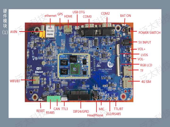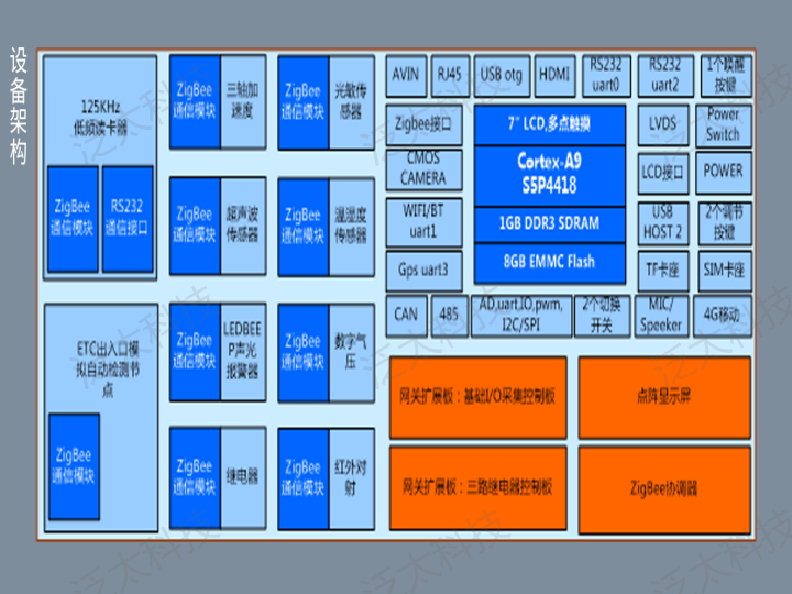 該產(chǎn)品采用ARM架構(gòu)三星四核處理器S5P4418,具有7寸LCD顯示屏,集成4G移動通信模塊、WiFi/BlueTooth二合一通信模塊、GPS衛(wèi)星定位模塊、ZigBee傳感網(wǎng)模塊,板載CAN/RS485總線接口、豐富的外設(shè)接口以及擴展模塊。