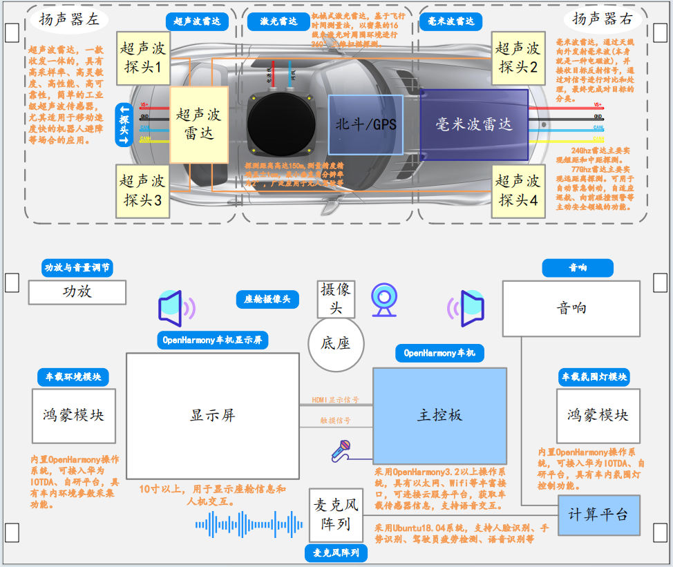 平臺(tái)包含中控計(jì)算平臺(tái)系統(tǒng)、鴻蒙車機(jī)及其顯示器、視覺(jué)傳感器、麥克風(fēng)陣列、音響設(shè)備、座艙艙體(含座椅、雨刮、車窗、方向盤、剎車踏板、加速踏板)、超聲波雷達(dá)、毫米波雷達(dá)等硬件,結(jié)合中控軟件系統(tǒng)、鴻蒙車機(jī)軟件、座椅控制程序,實(shí)現(xiàn)手勢(shì)識(shí)別、人臉識(shí)別、語(yǔ)音交互、駕駛員疲勞駕駛檢測(cè)、鴻蒙座椅遠(yuǎn)程調(diào)節(jié)、雨刮車窗控制、車載傳感器監(jiān)測(cè)、車機(jī)應(yīng)用娛樂(lè)等功能。