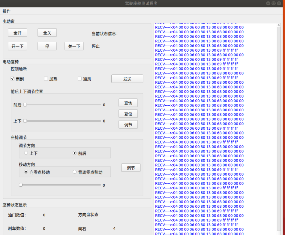 艙體,安裝了單臺(tái)主駕駛座椅、雨刮及電機(jī)、車窗及電機(jī)、方向盤、剎車踏板、加速踏板和座艙線控制器,通過(guò)座艙線控制器,接入到系統(tǒng)的CAN總線中,支持使用CAN分析工具測(cè)試艙體設(shè)備。